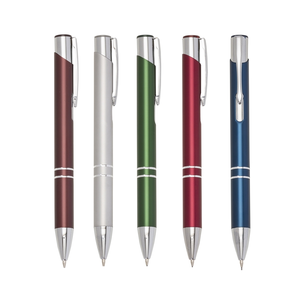 Lapiseira metal inteira colorida com detalhes prata. Clip metal com a ponta do acionador na cor da peça, parte inferior com dois anéis prata. Aciona por clique.