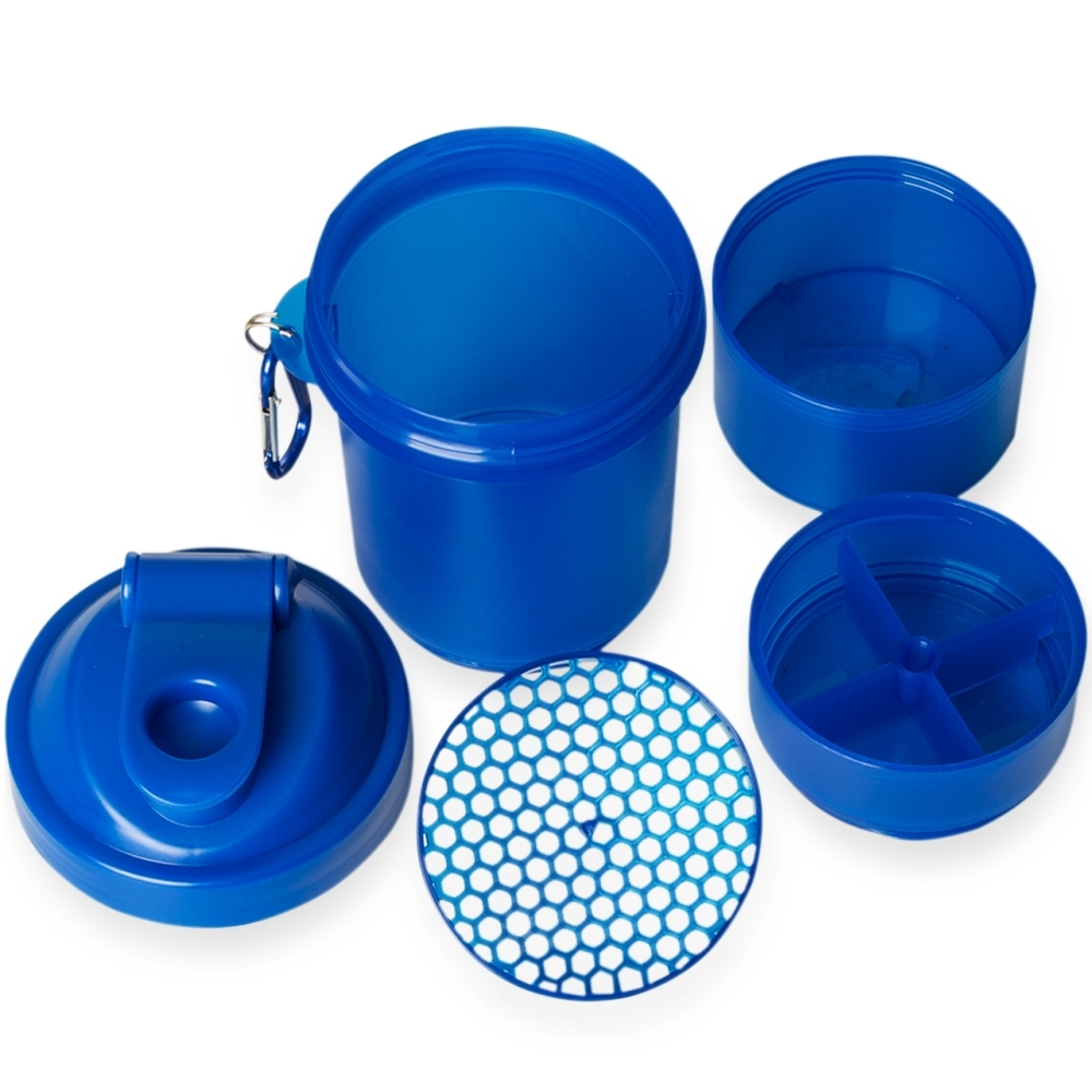 Coqueteleira 400ml plástica porta suplementos desmontável. Possui: copo 400ml(medida em ml e oz), compartimento com divisória para comprimidos, compartimento para armazenar shake/suplemento em pó, sendo todos estes rosqueáveis e possível guardar os dois compartimentos dentro do copo. Acompanha peneira, mosquetão, tampa de rosca e trava na própria tampa(basta levantar para beber).
