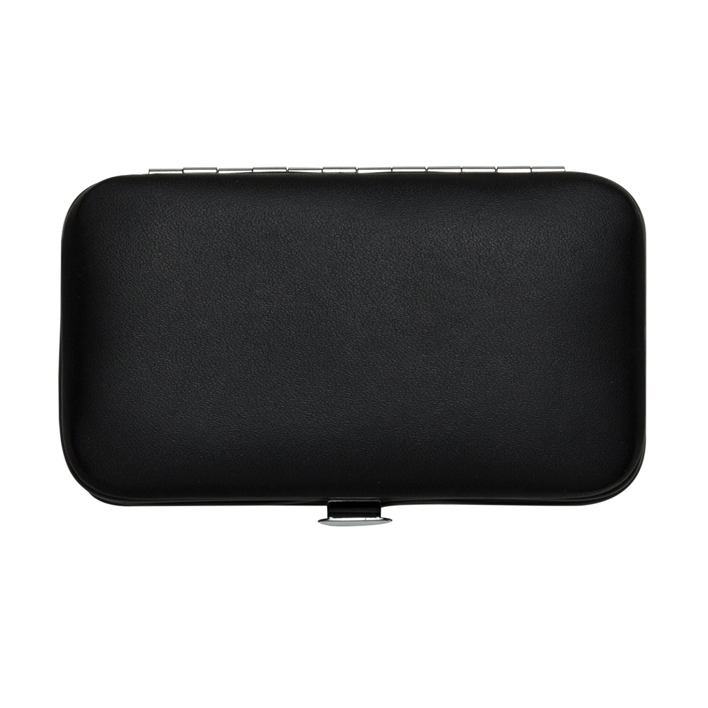 Kit manicure 6 peças em estojo de couro sintético. Possui: lixa, pinça, empurrador de cutícula, cortador de cutícula, tesoura e cortador de unha. Parte interna de plástico com suporte de couro para fixar as peças. Para abrir o estojo basta apertar o botão central.